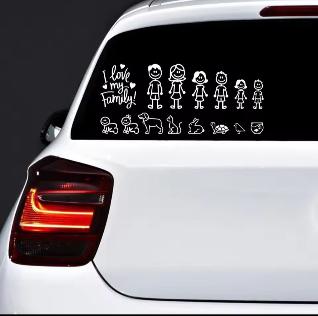 עשרות דמויות משפחתיות על מדבקות מיוחדות לרכב העשויות מחומר מיוחד שלא דוהה ועמיד בשטיפה אוטומטית.