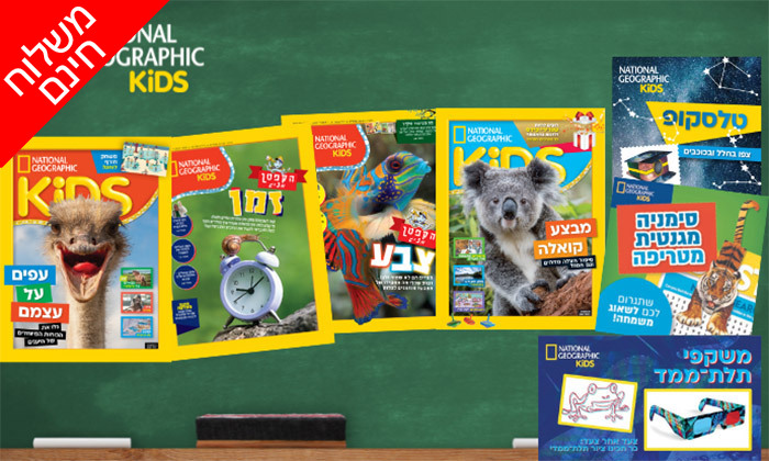 מארז נשיונל ג'יאוגרפיק ישראל לילדים: זוג גיליונות KIDS, זוג גיליונות קפטן KIDS והפתעה שונה מידי חודש. ב 28.90 ש"ח בלבד במקום 118 ש"ח