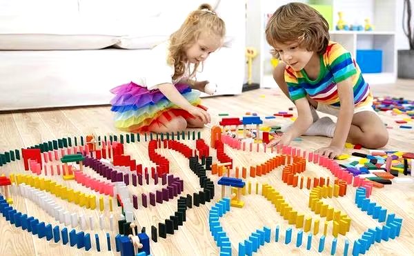 מעודד את הילדים לבנות, לסדר ולתכנן מסלולי דומינו צבעוניים וייחודיים.